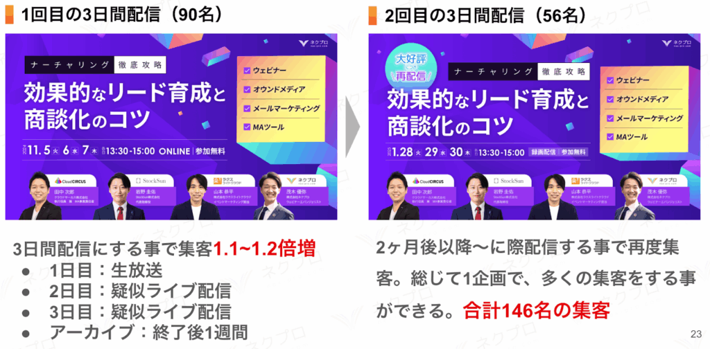また、反応が良かったウェビナーについては、1~2ヶ月以上の期間を空け、疑似ライブ配信という形で、再度集客をし放送することも有効な施策です。サムネイルは、「好評のため再放送」などのポップを入れ、作成をしてみてください。