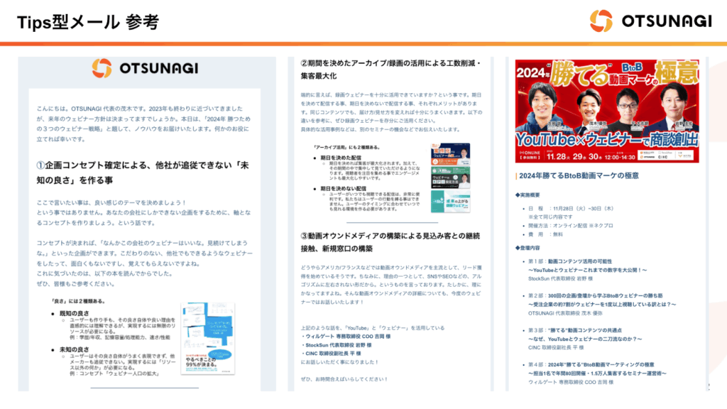 告知型メール(日時・テーマの案内)とTips型メール(ウェビナーの価値や実用性を伝える内容)を併用すると反応が高まります。理由として、受信者が内容に共感することで開封・クリック率が向上するためです。