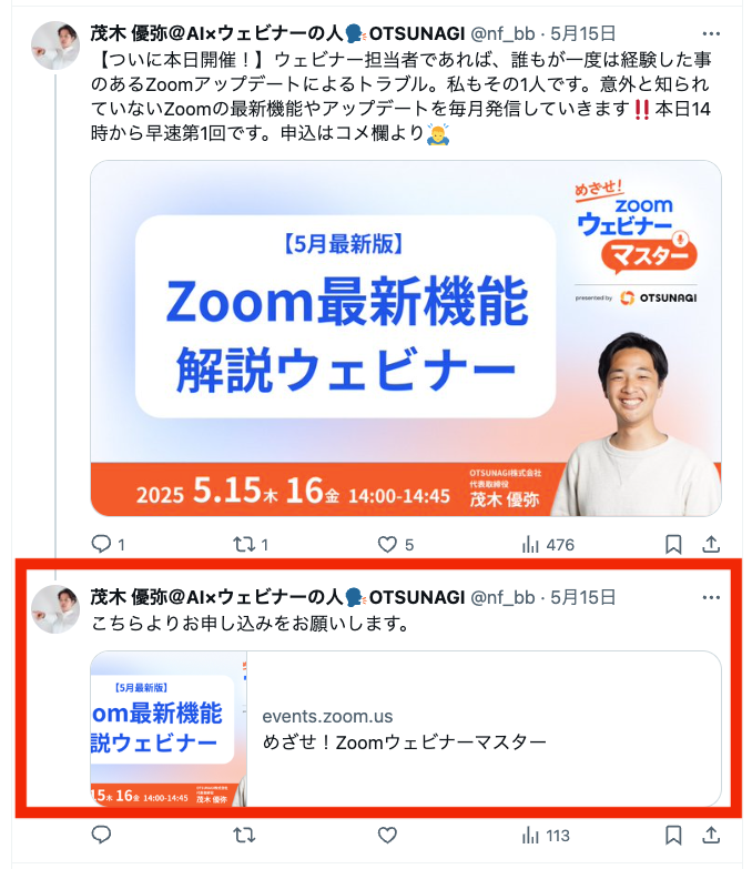 それは、Xで言えばメインのポスト、Facebookで言えばメインの投稿にリンクを貼らないと言うことです。