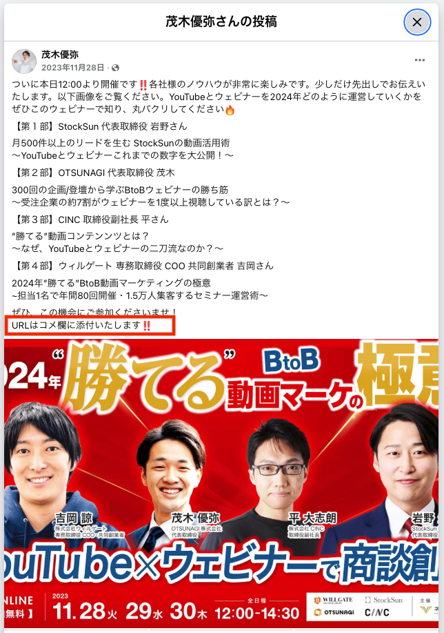 各媒体から、メイン投稿でリンクへ遷移するということは、該当するSNSから離脱を促す行為となります。そのため、以下のようにコメント欄にリンクを添付しイベントの告知をしてください。