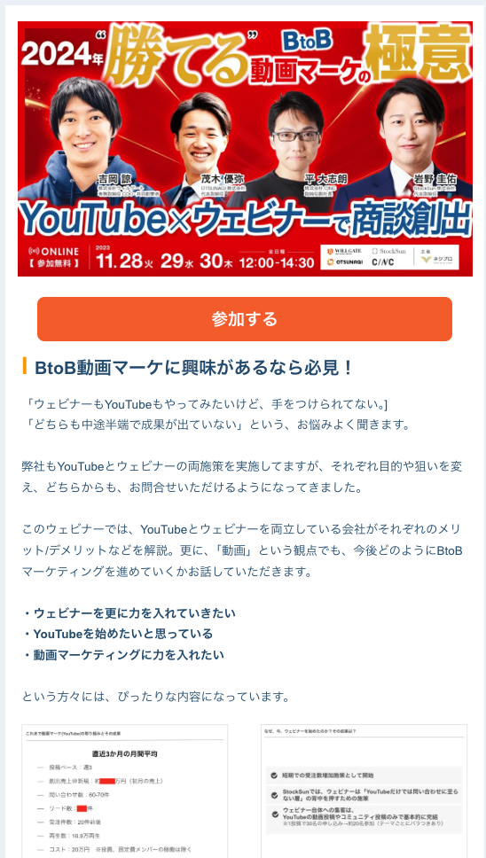具体的には、イベント開催の案内メールと並行して、事前にウェビナーの一部内容を示唆する実用的な情報を送るメールを配信。さらに、登壇者の経験談や事例などを紹介すると期待感が高まります。この併用により単なる告知以上の価値提供ができ、登録意欲が刺激されます。