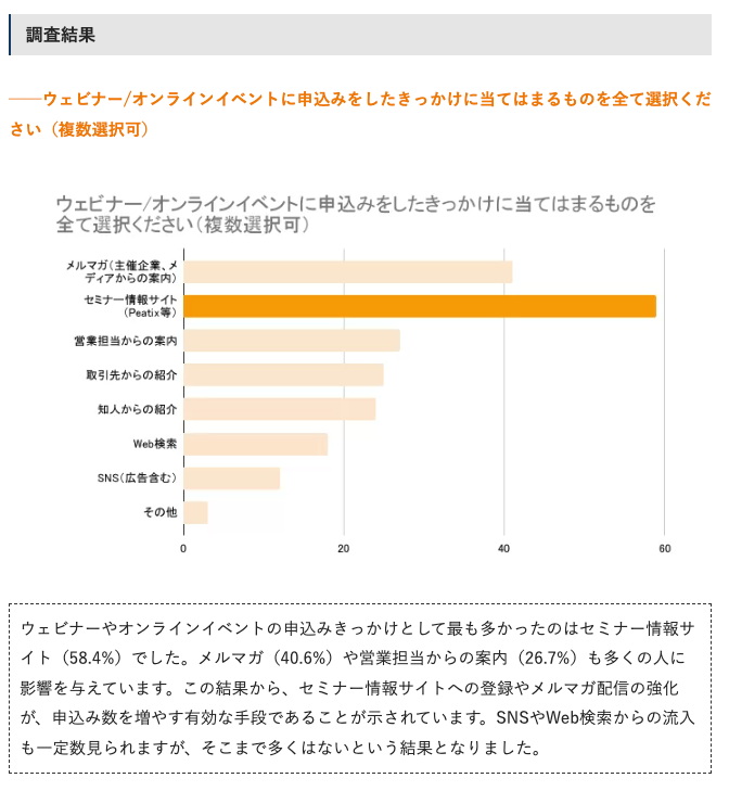 セミナー告知ポータルは、ウェビナーに関心を持つユーザーに情報を直接届けられるため効率的です。2024/07/03に公開された、「ウェビナー参加目的1位は「製品やサービスの情報収集(43.6%)」──BtoBオンラインイベント実態調査」では、「ウェビナー/オンラインイベントに申込みをしたきっかけに当てはまるものを全て選択ください(複数選択可)」と言う質問で、2番目に多く表が入っていました。
