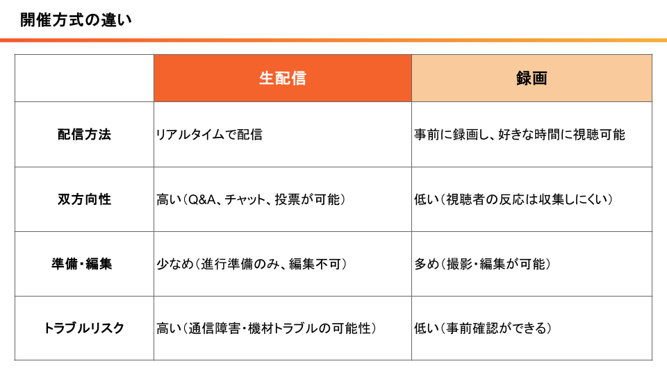また、特に注目したいのは準備・編集観点の違いです。近年は開催形式が多様化しており、生配信・録画配信どちらの方が準備が楽かは一概には言えません。