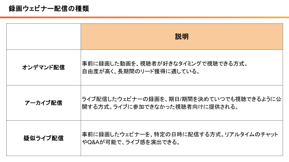 録画配信は、オンデマンド、アーカイブ、疑似ライブの3つに分けられます。