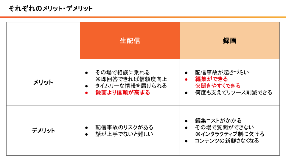 一方で、編集に踏み込むほど準備工数とコストが増えること、リアルタイムの質疑応答ができないことがデメリットです。また、トレンド依存の内容は時間の経過とともに鮮度が落ちやすく、情報更新のたびに取り直しが必要になります。