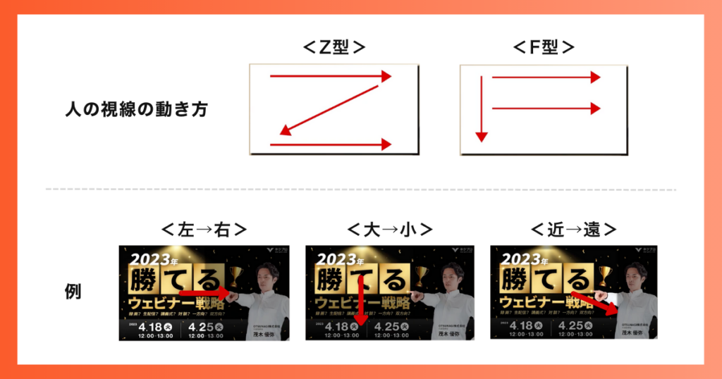 視線の動きは、Z型やF型が基本です。左上から右下へ、または左上から右へ視線が流れる前提で情報を配置します。