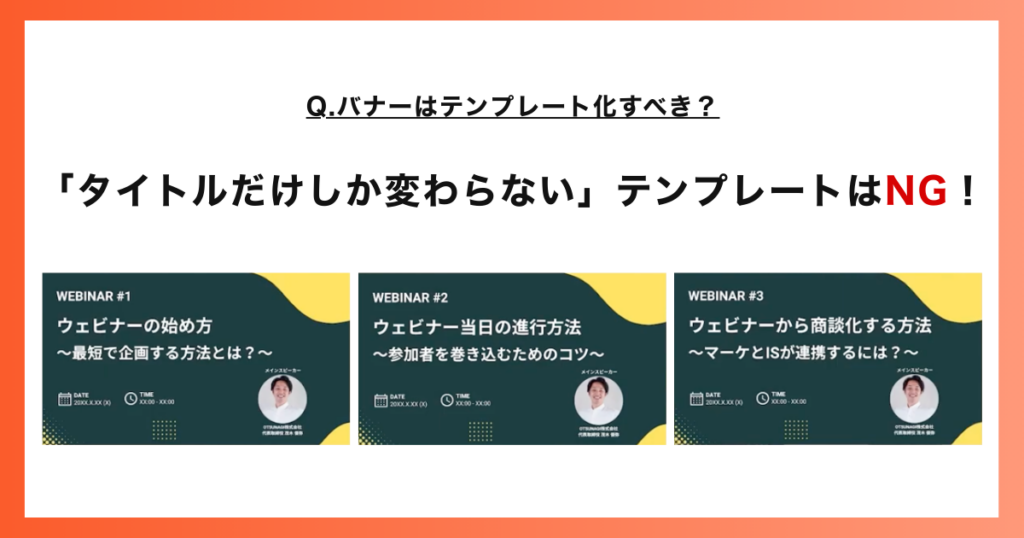 バナーをテンプレート化すべきかどうかは、場合によります。一方で、「タイトルだけしか変わらない」テンプレートは、よく見ないと内容の違いがわからないため避けた方が無難です。背景色や簡単な背景デザインは変更するようにしましょう。
