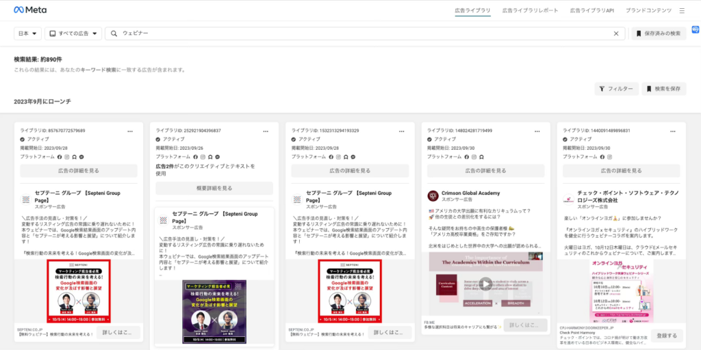 最初に必要情報を揃え、参考バナーを収集します。Canva、Pinterest、Meta広告ライブラリは参考素材が多く、イメージを掴みやすい媒体です。以下の画像は、Meta広告ライブラリの例です。