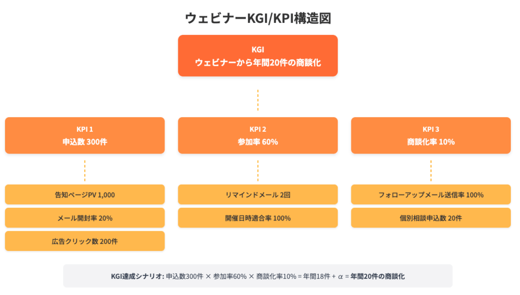 KPIツリーとは、KGIを頂点に据え、その達成に必要な主要KPI・サブKPIを階層的に整理した構造図です。例えば、KGIが「ウェビナーから年間20件の商談化」ならば、以下のように分解できます。