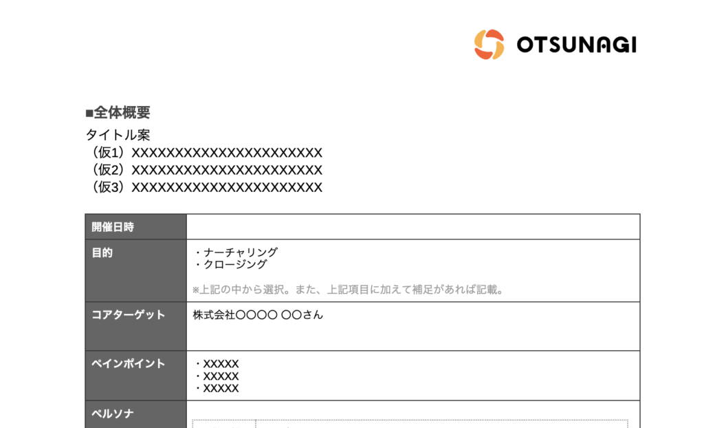 この記事で解説しているウェビナー企画の作り方を踏襲した、OTSUNAGI特製の企画書テンプレートを無料でプレゼントいたします!