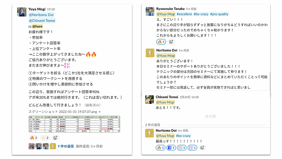 成功事例として、株式会社SAKIYOMIではアンケート設計を工夫し、終了30分以内に電話をかけることを徹底しました。これにより、商談設定数が2倍になりました。さらに、マネジメント層が営業チームを励まし、社内の一体感を高めたことで、成果が加速しています。