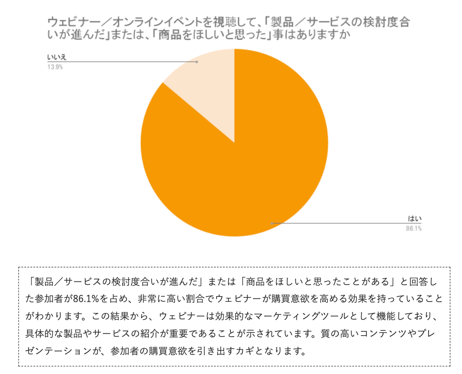 直近のデータでも、ウェビナー視聴後に商品の検討度合が進んだり、紹介していた商品を欲しいと思ったと回答したりした参加者が86.1%を占めていました。