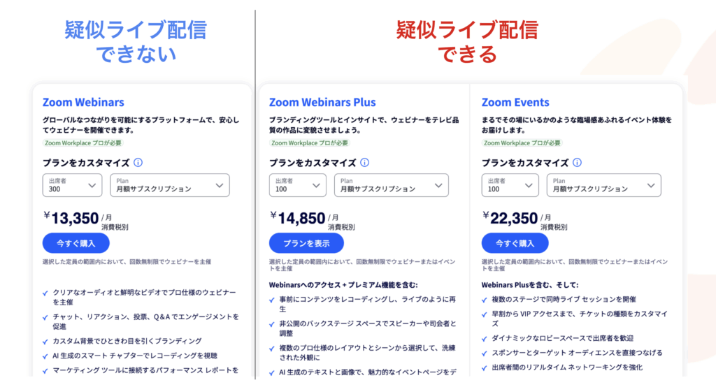 また、普段からウェビナーを実施されている方にとって分かりやすくお伝えすると、「Zoom Webinars Plus」より上のプランが、疑似ライブ配信が可能になります。