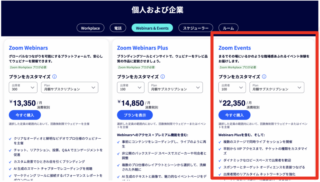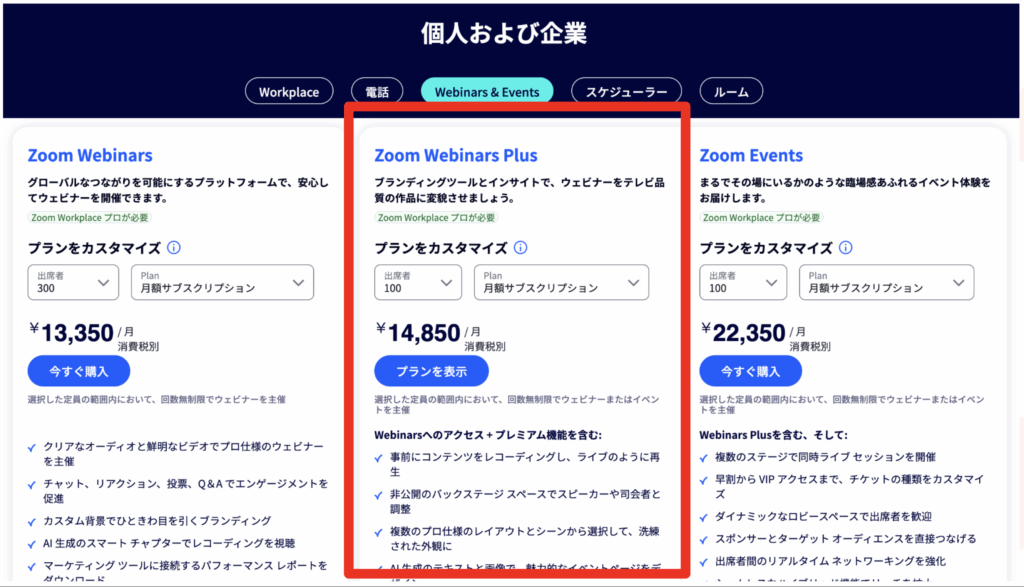 Zoomウェビナー系プランは、Zoom Workplace Pro以上(月額約2,000円〜)の有償プランに加え、各アドオンが加算される形式です。すなわち、基本契約+各プランの追加費用が必要になります。