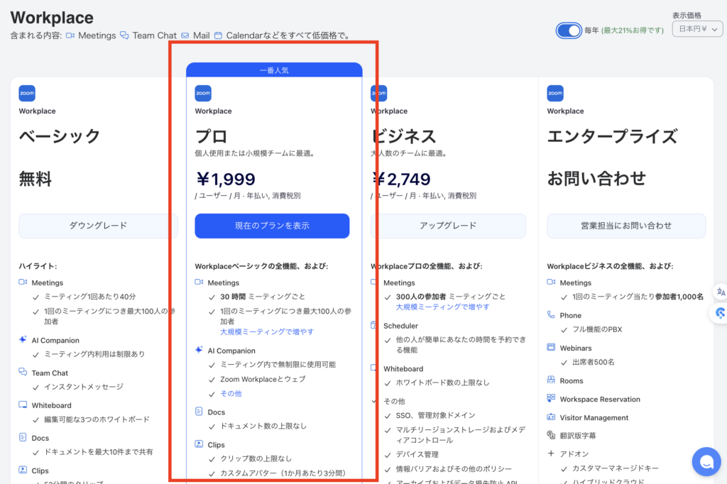 各プランの料金は変動する可能性があります。最新情報はZoom公式サイトを必ずご確認ください。