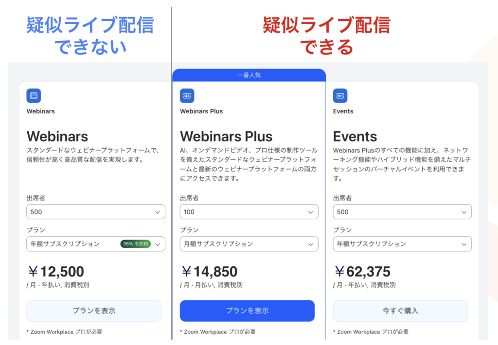 また、普段からウェビナーを実施されている方にとって分かりやすくお伝えすると、「Zoom Webinars Plus」より上のプランが、疑似ライブ配信(時間になったら自動でウェビナーが始まって、自動で終わる)が可能になります。