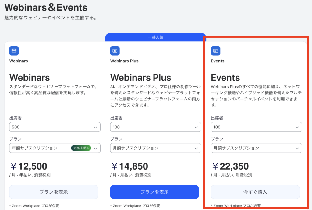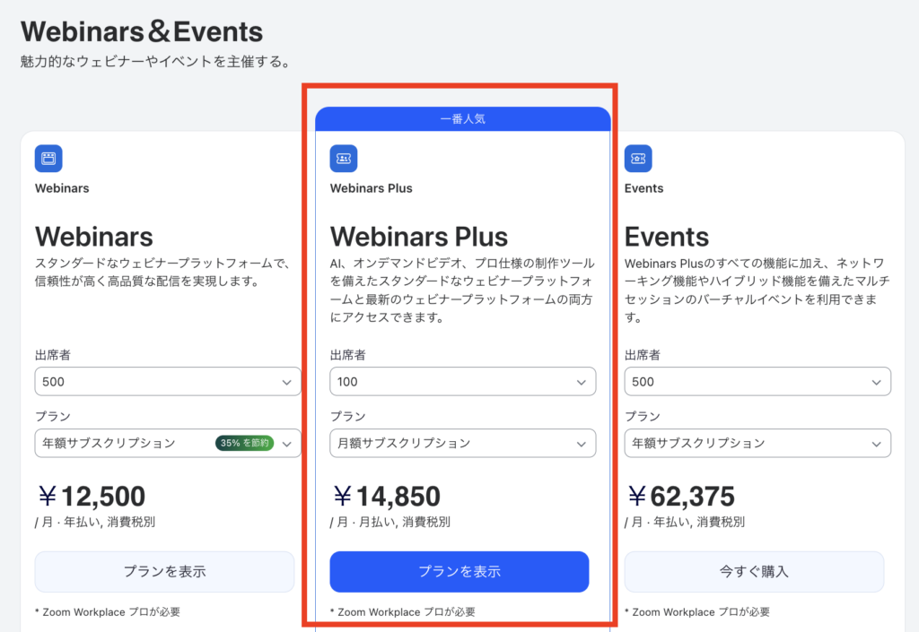 Zoomウェビナー系プランは、Zoom Workplace Pro以上(月額約2,000円〜)の有償プランに加え、各アドオンが加算される形式です。すなわち、基本契約+各プランの追加費用が必要になります。
