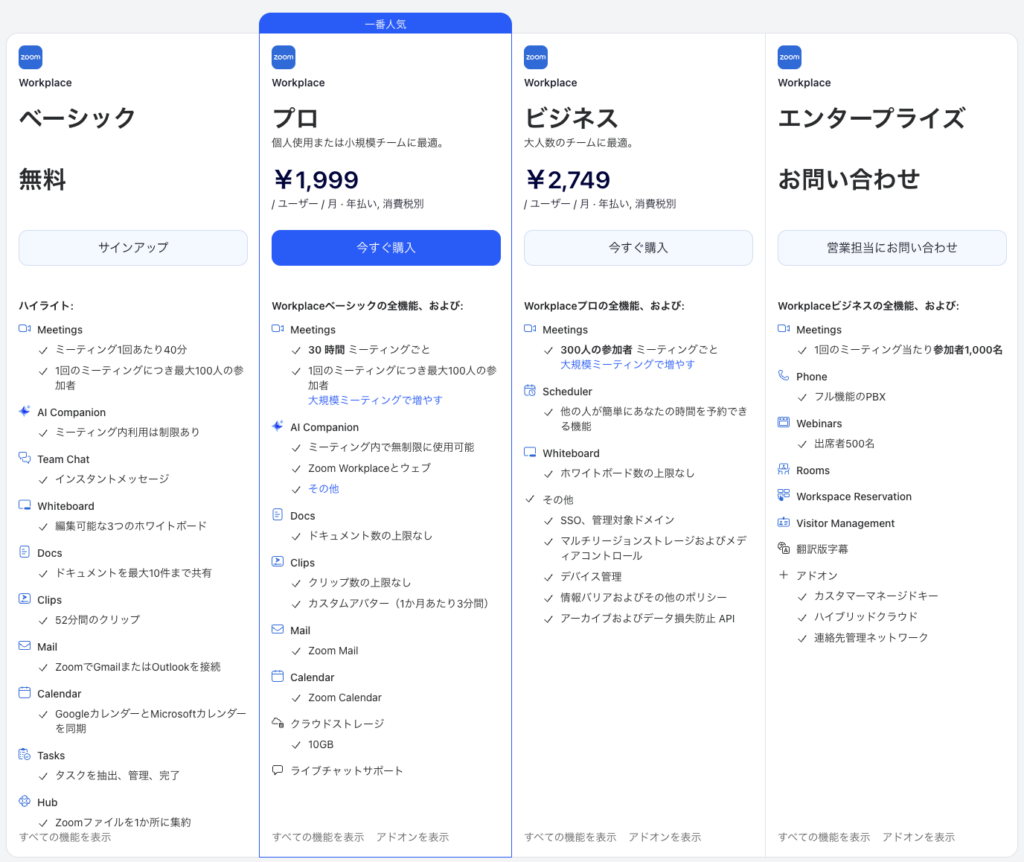 「Zoom Workplace」のプランは以下となります。詳しくはZoom公式の料金プランページでご確認ください。